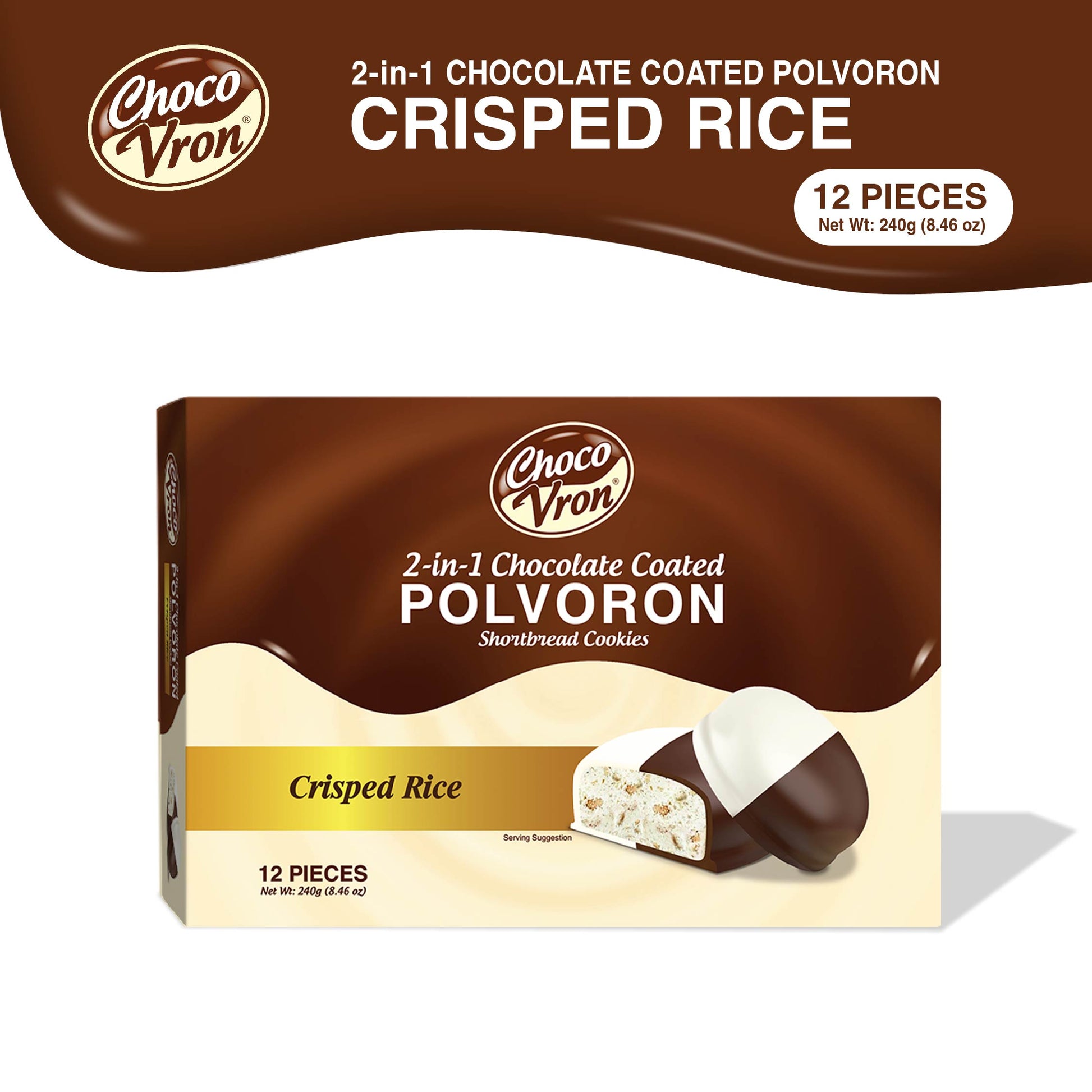 ChocoVron is re-invented polvoron that is cooled with either dark bittersweet, chocolate, creamy white chocolate, or both. It is made from a perfect blend of toasted flour, milk, butter, sugar, and other specially selected ingredients or flavors (No Preservatives) giving ChocoVron its distinct flavor and texture, then compressed to form solid little cakes.